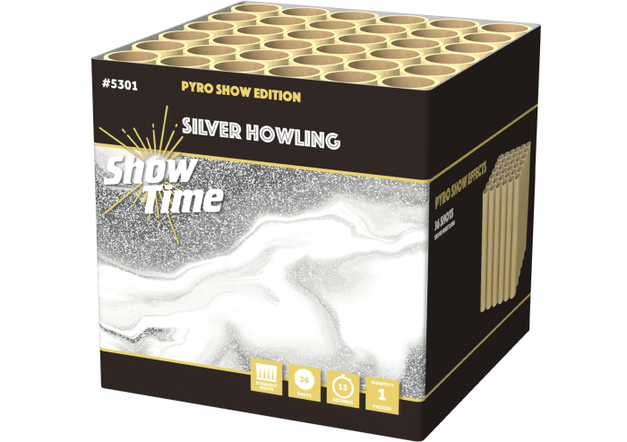 500 g powercake met scherpe, zilveren fluiters. Deze 36 shots cake biedt een strak zichtbeeld en ritmische whistling klanken die je show extra pit geven. 25 mm kaliber zorgt voor stevige hoogte en impact.