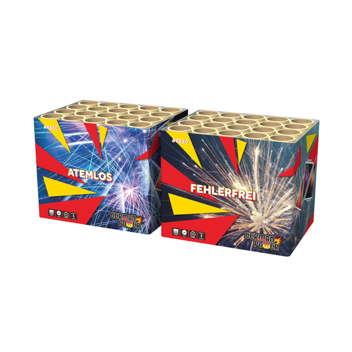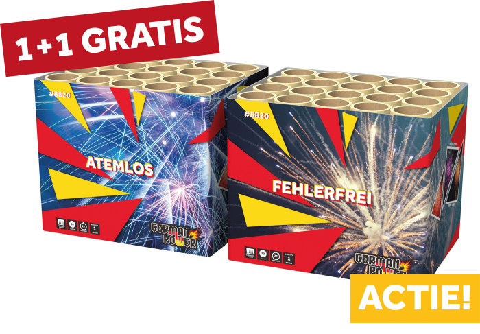 Atemlos en Fehlerfrei! Twee cakes met ieder 20 schoten, 40 schoten in totaal. Beide cakes bevatten ieder 200 gram kruit. Ben jij ook fan van golden crown, gekleurde sterren, strobe en palm effecten? Dan ben je bij de Atemlos en Fehlerfrei aan het juiste adres!