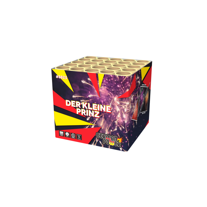 De naam doet misschien anders vermoeden maar Der Kleine Prinz schiet gigantische effecten de lucht in met een kaliber van maar liefst 30mm. 25 schoten met gekleurde palmen, blink, golden crown en dahlia effecten. Een ware knaller!