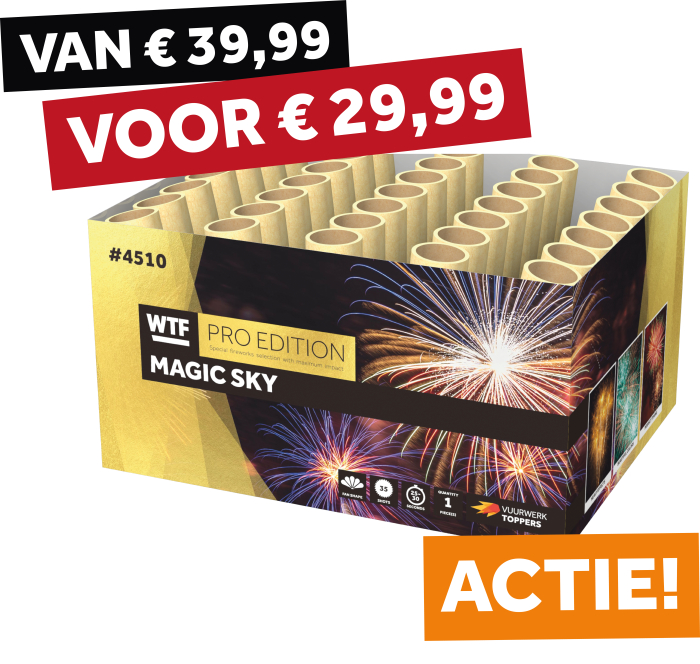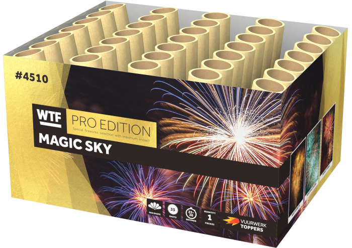 Wat een kraker, de Magic Sky! Deze 35 schots cake schiet in waaiervorm zijn effecten de lucht in, voor een extra groot en breed effect. Volop crackling chrysanthemum effecten, mijnen, grote boeketten en rode sterren.