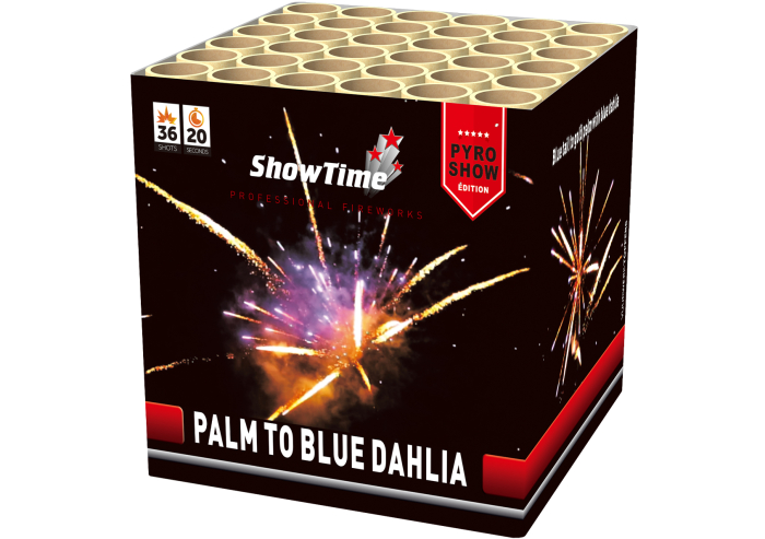 Deze cake schiet 36 shots met gouden palm- en willoweffecten die uitlopen in blauwe dahlia’s. Het 25 mm kaliber en de 500 GRAM lading zorgen voor een breed en duidelijk effectbeeld.