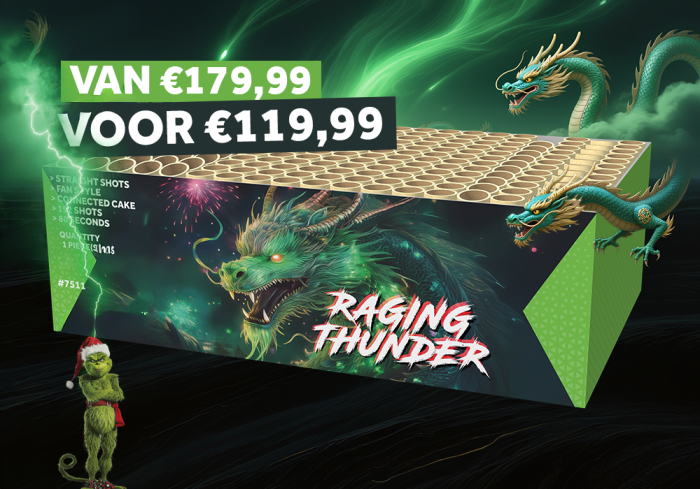 Raging Thunder brengt 1,5 KG puur showgeweld in één box. De lucht vult zich met titanium gold palms met scherpe kleuraccenten, gevolgd door paarse sterren die schitteren in groene glitter. Daarna weer die volle goudpalmen met groene sparkle voor extra diepte. Een compacte compound met tempo, variatie en power.