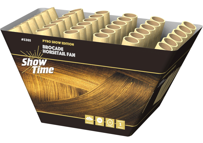 Deze fanshape cake schiet gouden brocade horsetails in strak tempo. De 36 shots, 500 GRAM, 25 mm cake, trekt lange, volle tails door de lucht en zorgen voor een krachtig goudbeeld.