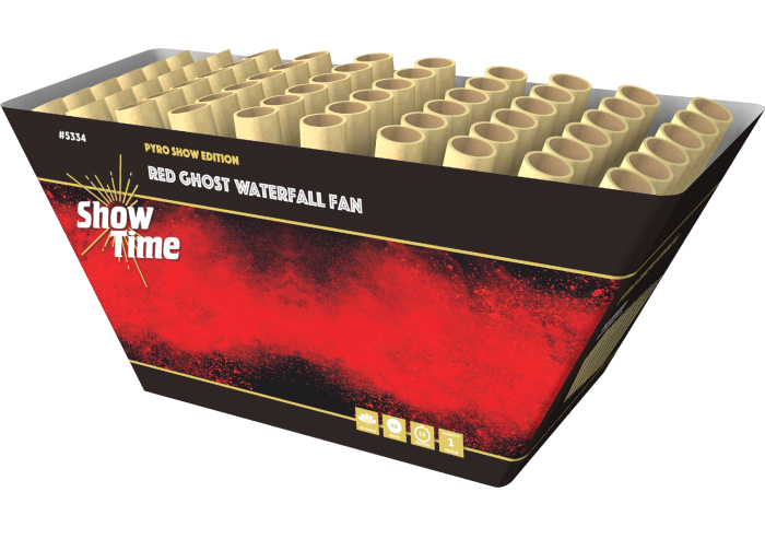 Deze fanshape cake knalt 60 shots diep rood met ghost effecten in strak tempo. Met 20mm kaliber en bijna 500 GRAM lading valt het effect breed omlaag en blijft het beeld lang hangen.