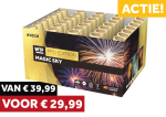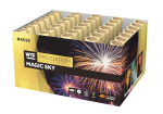 Wat een kraker, de Magic Sky! Deze 35 schots cake schiet in waaiervorm zijn effecten de lucht in, voor een extra groot en breed effect. Volop crackling chrysanthemum effecten, mijnen, grote boeketten en rode sterren.