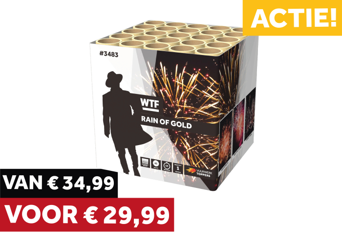 Goudgekleurde mijnen worden opgevolgd door gouden glitter, blauwe, paarse, gele en rode sterren en eindigen in een ongekende finale! De 25 schoten in deze cake worden in een spectaculair salvo afgevuurd!